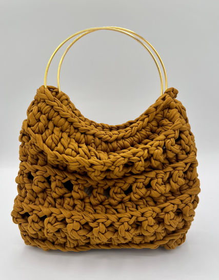 Bolso realizado con trapillo, hilo de algodón reciclado 100%, lo que lo convierte en una pieza muy resistente. Sus asas metaicas redondas permiten llevarlo en la mano y adecuarlo a situciones más formales, este bolso incluye una cadena larga metalica como asa larga, para hacer de él una pieza todavía más versátil.